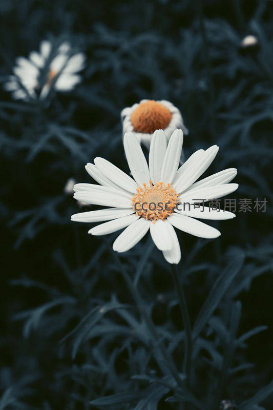在冷蓝色调的衬托下,一朵雏菊的细节被放大,白色花瓣与橙黄花心形成鲜明对比,赋予画面一种冷静而富有设计感的艺术气质。