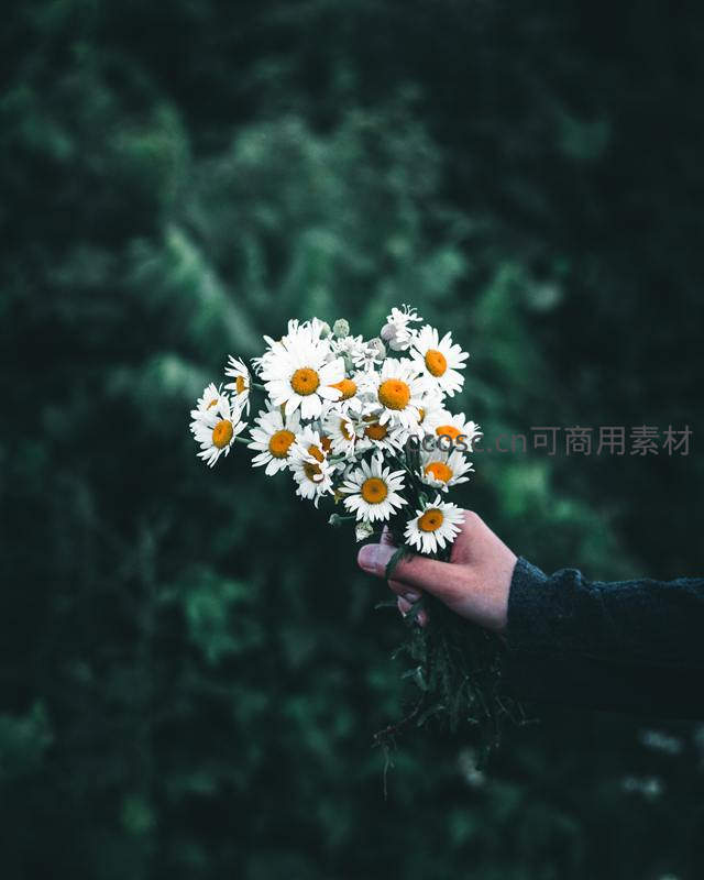 一只手轻柔地捧着一束盛开的白色雏菊,背景是朦胧的深绿色植物,营造出宁静自然的氛围。