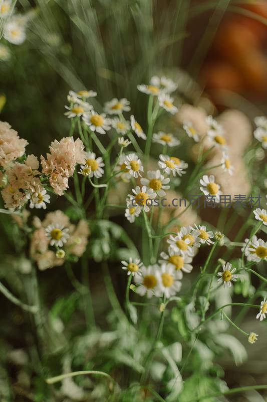 一片生机勃勃的野雏菊丛中,几朵淡粉色的花朵悄然点缀其间,绿意盎然的背景虚化,营造出柔和梦幻的春日景象。