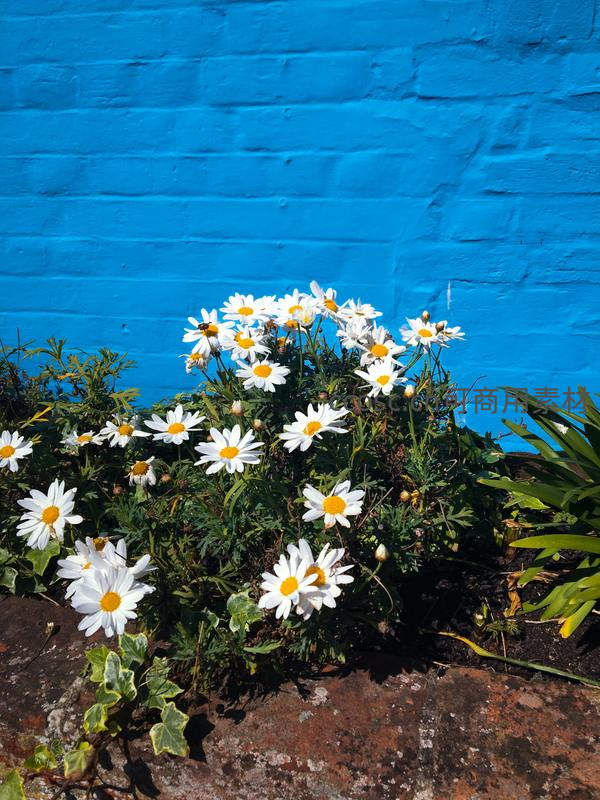 一丛洁白的雏菊在明亮的蓝色砖墙前灿烂绽放,阳光洒落,绿叶相衬,充满盎然春意与活力。