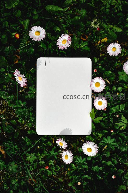 一张纯白卡片置于青翠草地上,四周散落着数朵雏菊,为平面设计或文字排版提供清新自然的视觉背景。