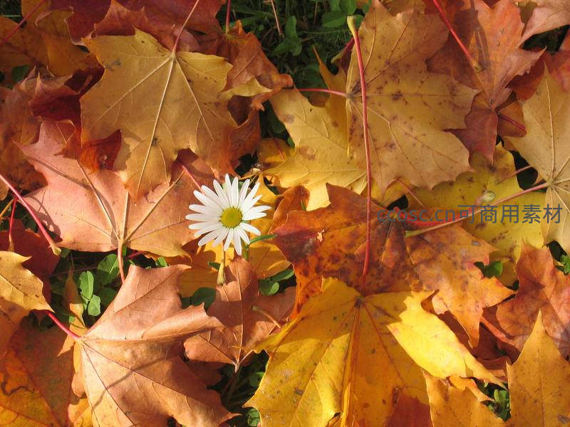 在一片金黄与棕红交织的枫叶堆中,一朵洁白的雏菊悄然绽放,形成强烈的视觉对比,展现秋日自然的诗意与生命力。
