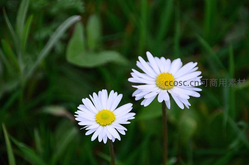 两朵洁白的雏菊并肩立于翠绿的草丛中,花瓣细腻,花心金黄,在柔和的自然光下显得格外清新可爱,充满勃勃生机。