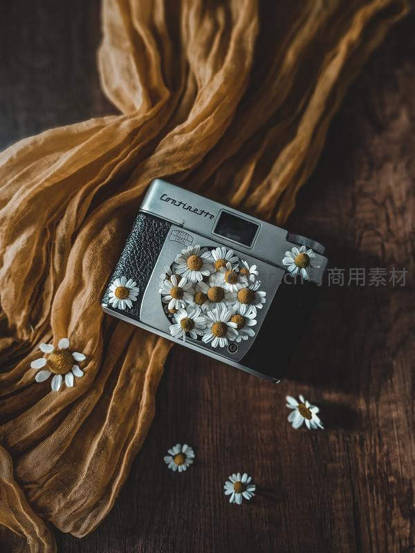 一台老式胶片相机上点缀着洁白的雏菊,搭配暖色调的丝巾和木质桌面,营造出温馨怀旧的氛围。