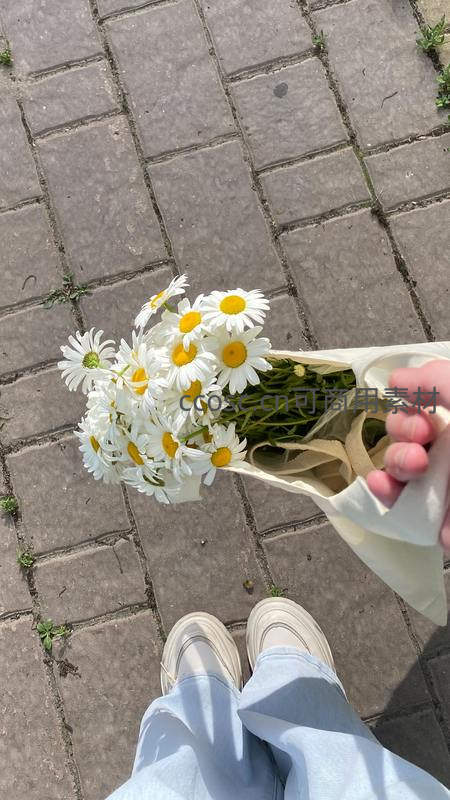 从第一人称视角俯瞰,手中提着装满雏菊的纸袋,脚边是整齐的石板路,记录一次悠闲的城市漫步时刻。