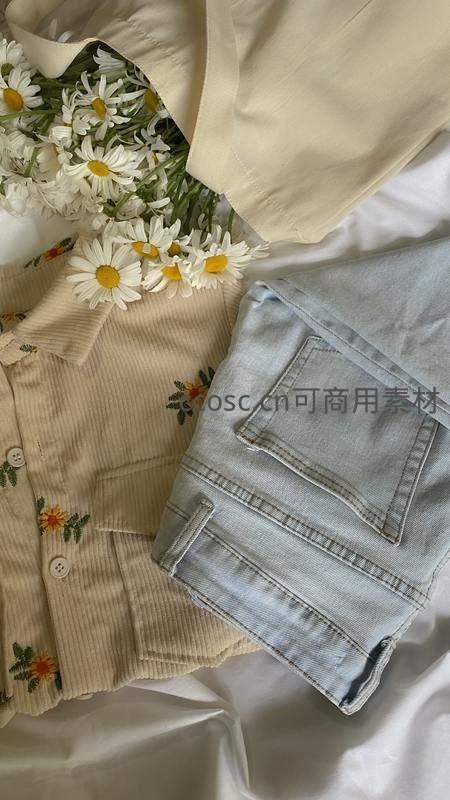 米色雏菊刺绣衬衫与浅蓝牛仔裤平铺展示,搭配新鲜雏菊,营造出舒适惬意的春日氛围。