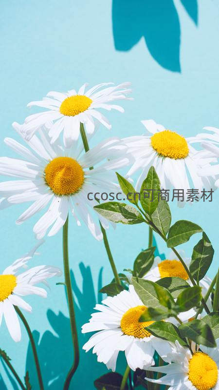 几朵雏菊在明快的蓝色背景前盛放,鲜绿的叶片与洁白的花瓣形成鲜明对比,充满夏日的清新与活力。