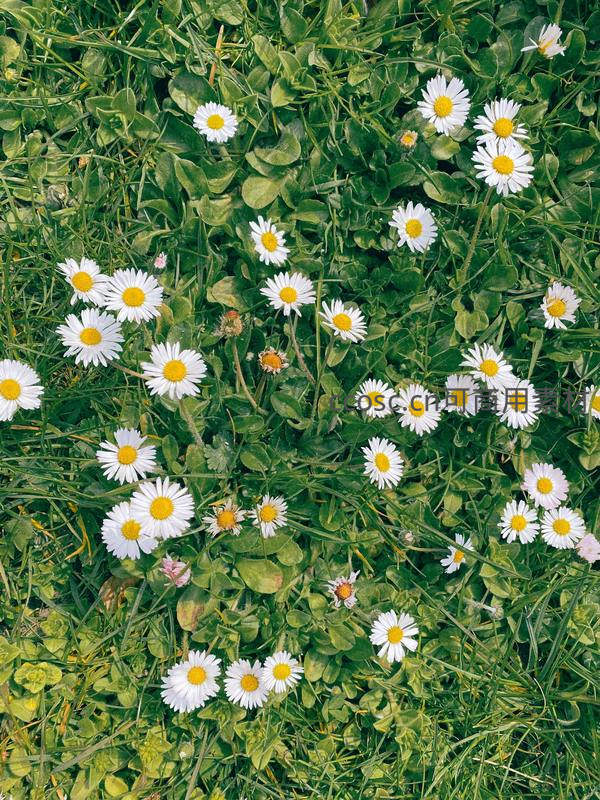 俯瞰绿茵草地上的雏菊,星星点点如散落的珍珠