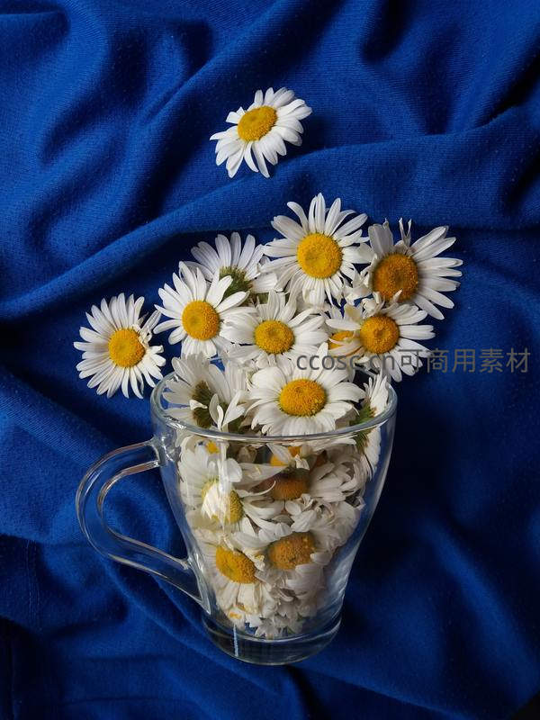 透明玻璃杯盛满白色雏菊,置于深蓝色褶皱布料之上,色彩对比鲜明,构图简洁而富有艺术感,营造宁静雅致的氛围。