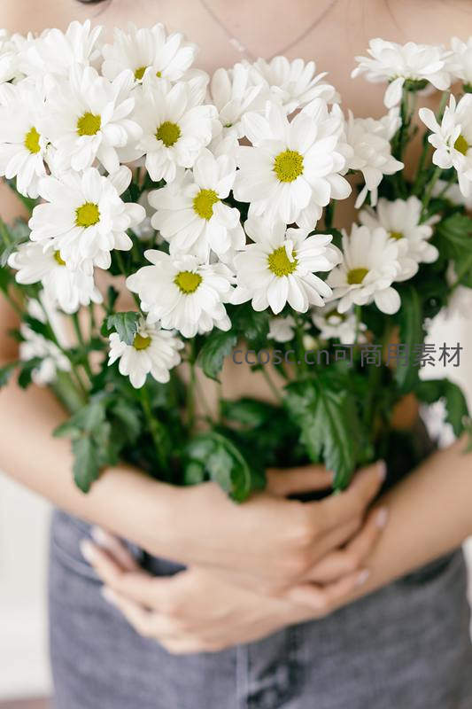 一双温柔的手臂环抱着一大捧盛开的白色雏菊,绿叶衬托着花朵,传递出纯粹而温暖的生活气息。