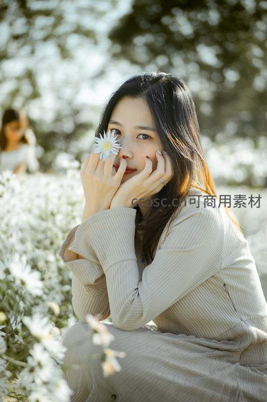 花丛中少女手持雏菊微笑