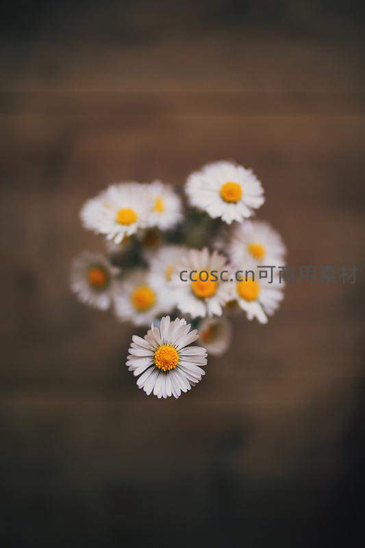前景清晰的雏菊与模糊的木质背景形成强烈对比,柔焦效果赋予画面梦幻感,凸显花朵的精致与宁静。