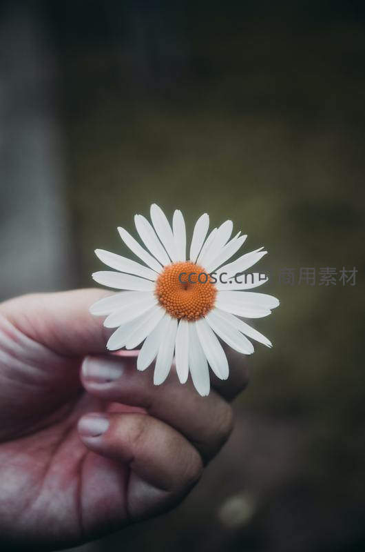 手掌轻握一朵雏菊,花瓣洁白细腻,花心橙黄饱满,背景虚化突出主体,传递出温柔、静谧与自然之美。