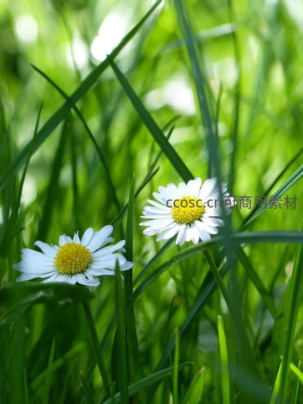 在翠绿的草叶间隙,两朵雏菊迎着阳光悄然绽放,仿佛在低语,传递着自然界的温柔与和谐。