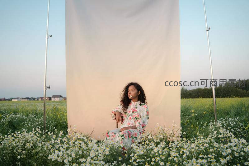夕阳下,卷发女子身着碎花裙坐在雏菊花田中,轻吹泡泡,背景是柔和光线下宁静的田野与简易布景。