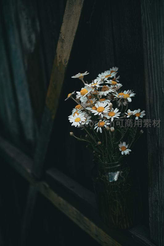 玻璃瓶中的雏菊束,暗色木墙背景营造静谧氛围