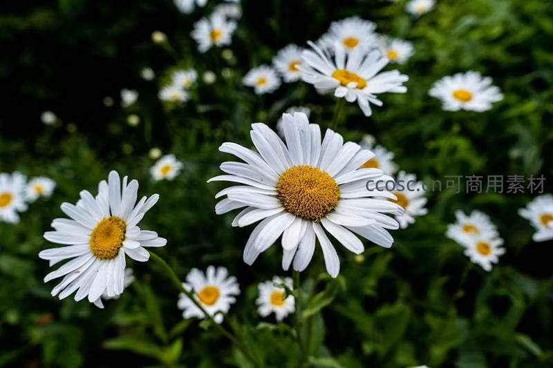 在柔和的自然光下,几朵雏菊在绿叶丛中静静绽放,洁白的花瓣与明亮的黄色花蕊构成一幅宁静而美好的画面。