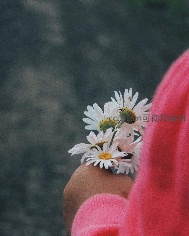 手捧雏菊,粉色衣袖衬托出花朵的温柔与浪漫