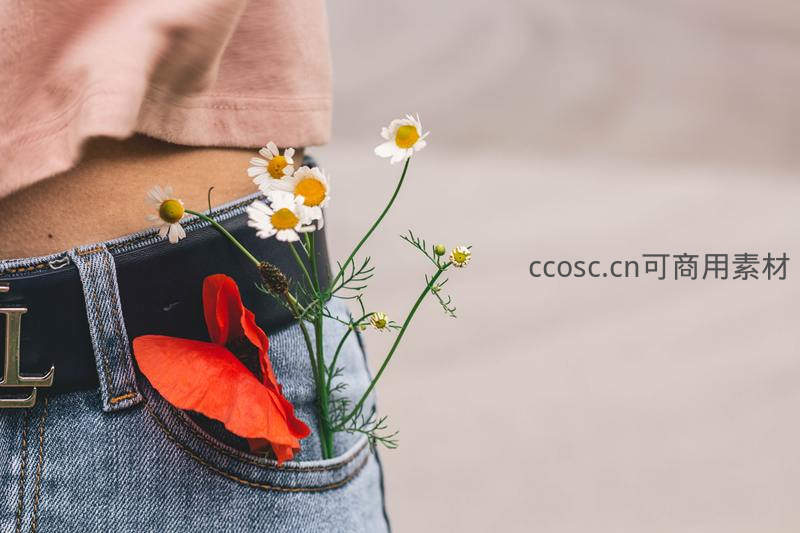 一位穿着牛仔裤的人将几朵雏菊和一朵红色罂粟花插在后袋中,展现自然与日常穿搭结合的浪漫随性风格。