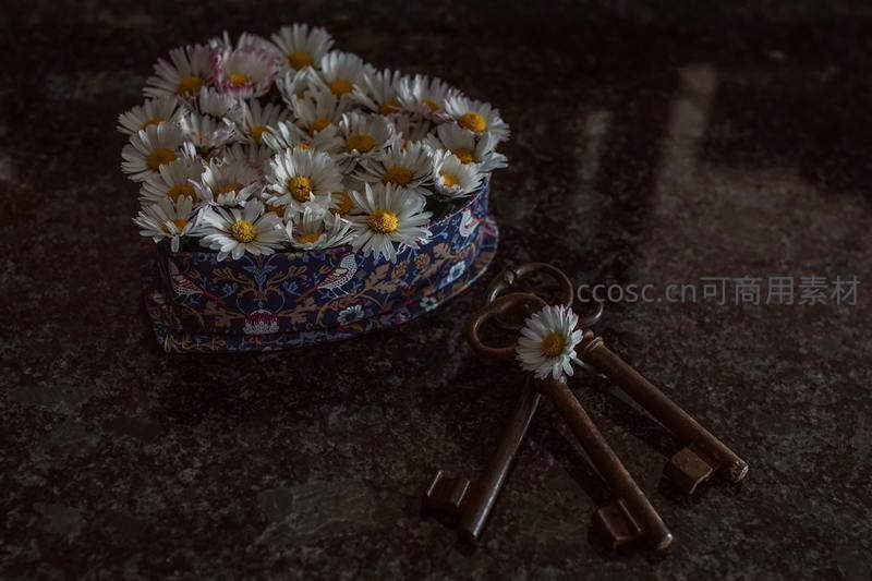一个精美的心形盒子盛满雏菊,旁边摆放着三把系有小雏菊的古旧钥匙,在深色背景衬托下显得浪漫而神秘。