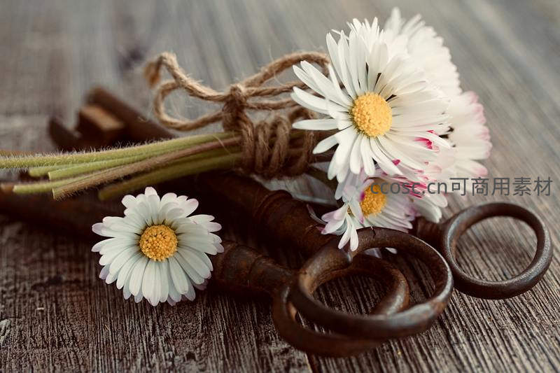 几朵雏菊用麻绳与古铜钥匙捆扎在一起,放置在质朴的木纹背景上,展现出一种手工制作的自然复古美感。