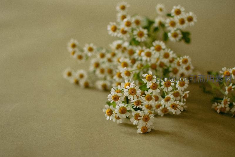 一小束雏菊随意散落在素雅的浅色布面上,构图简洁,光线柔和,散发着宁静、清新的视觉美感。