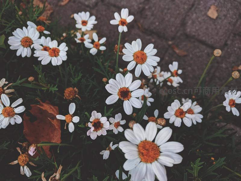 在灰暗的石板缝隙中,一簇簇白色雏菊顽强绽放,橙色花心鲜艳夺目,枯叶点缀其间,展现出自然的生命力与野趣。