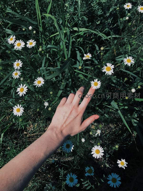 指尖轻触草丛中的雏菊,亲近自然