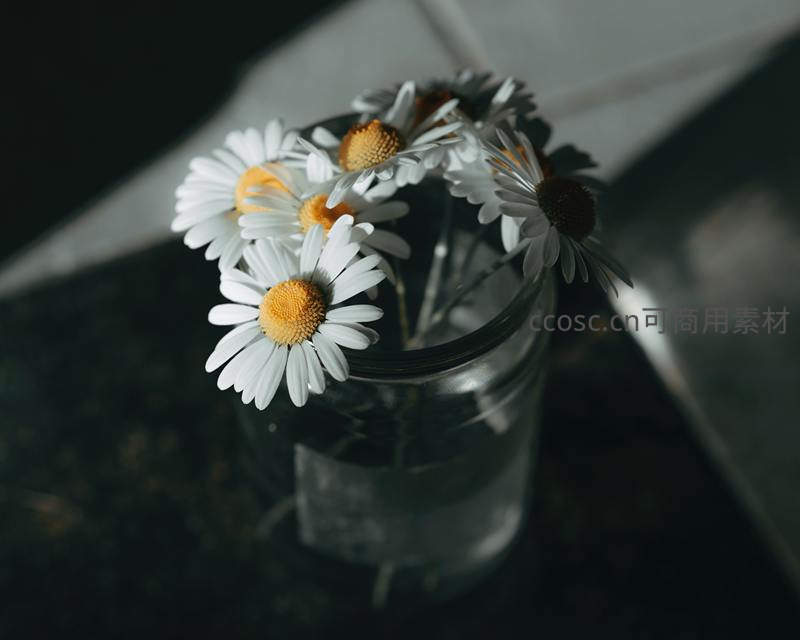 几朵雏菊插在透明玻璃瓶中,柔和光线洒落,营造出宁静温馨的居家氛围。