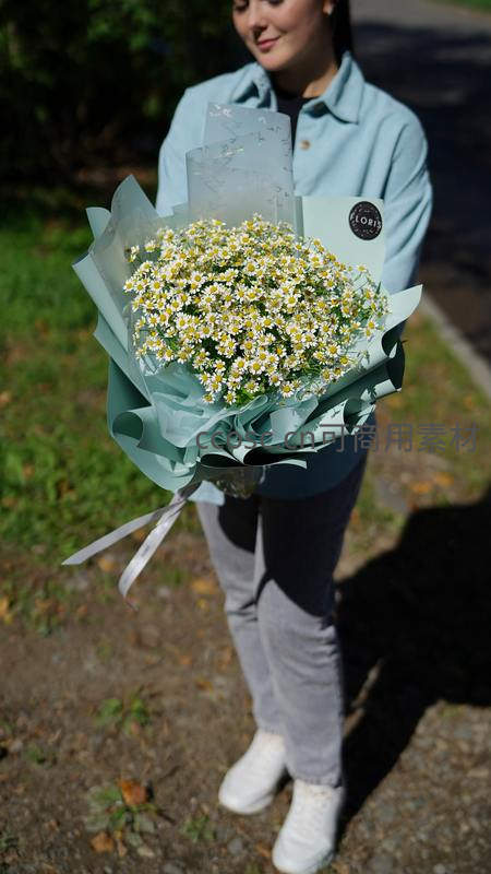 一位年轻女子身穿浅蓝色上衣,手持一束精心包装的雏菊花束,面带微笑站在户外,洋溢着青春与温馨的气息。