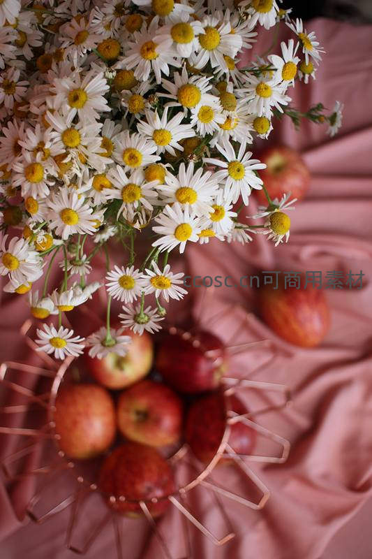 粉色布景上的雏菊与苹果静物组合