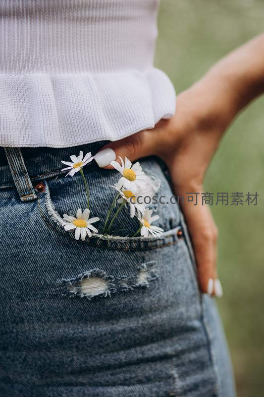 一位女士将几朵洁白的雏菊插在破洞牛仔裤的后袋中,搭配白色褶边上衣,展现了轻松惬意的田园风格。