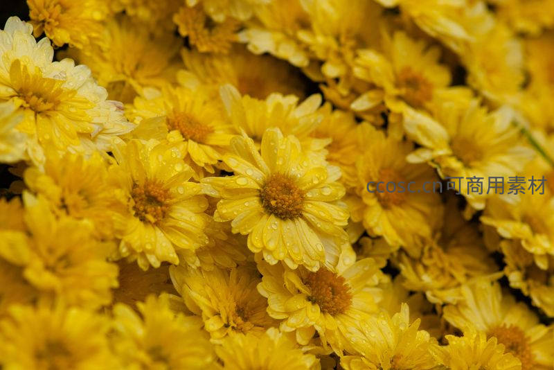 微距镜头下,娇嫩的黄色菊花花瓣上挂满了晶莹剔透的水珠,展现了雨后花朵的清新与柔美。