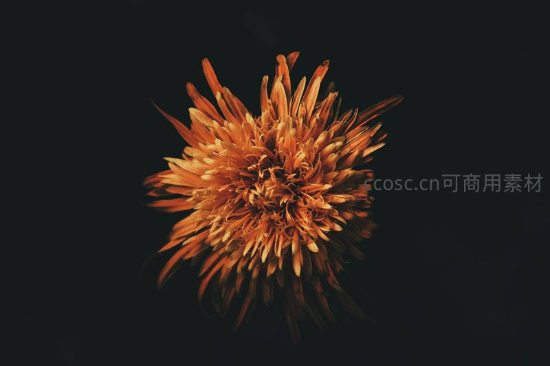 一朵橙色菊花在漆黑背景中独自绽放,炽热的色彩与深邃的黑暗形成强烈对比,花瓣纤细舒展,传递出孤傲而热烈的生命力。
