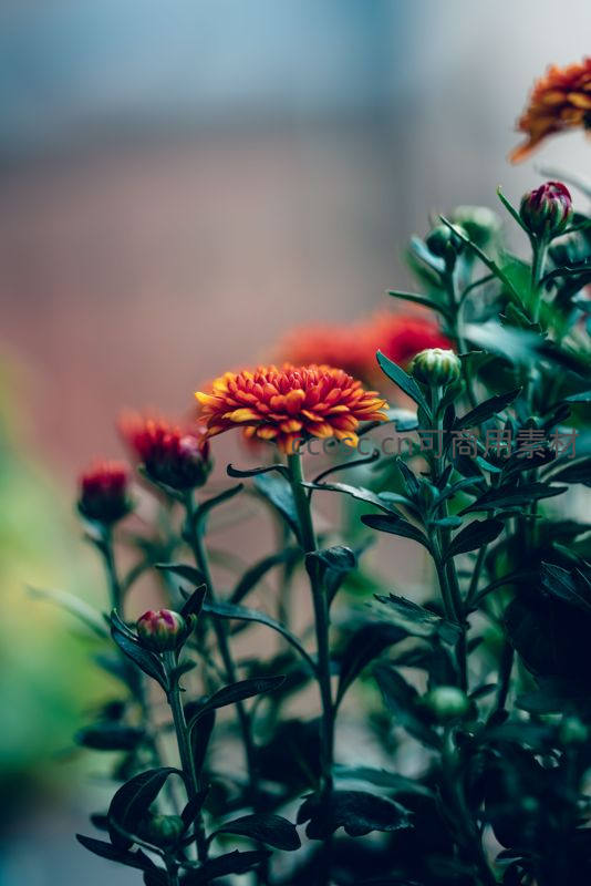 橙红菊花在绿叶间悄然绽放