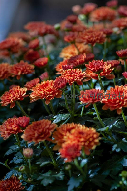 橙色菊花丛生,绿叶相映成趣