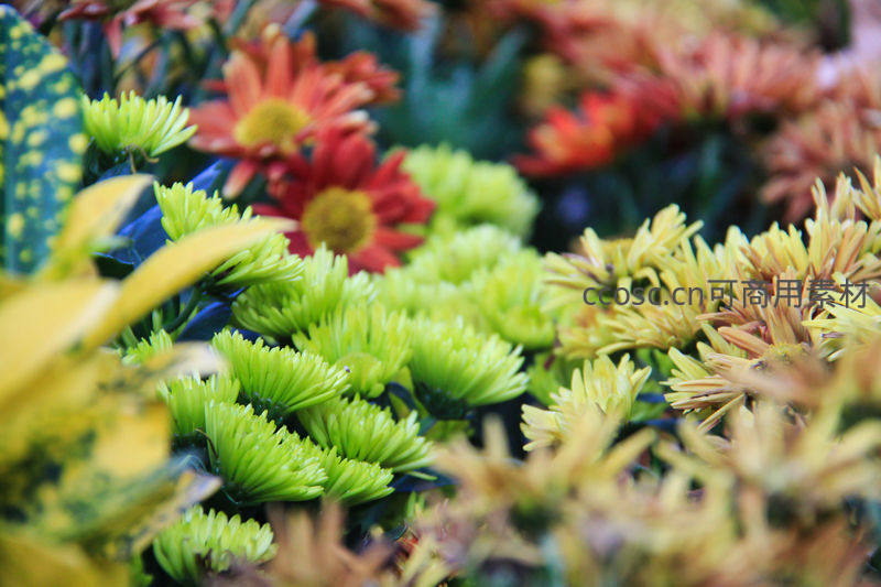 多彩菊花争艳,绿黄红交织成画