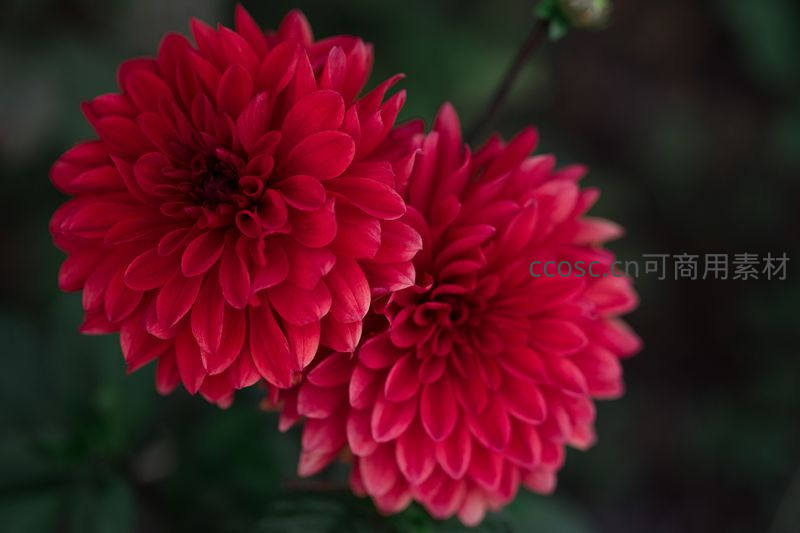 两朵饱满的深红色大丽花在暗色背景下盛放,花瓣繁复而富有层次感,展现出浓郁热烈的生命力与自然之美。