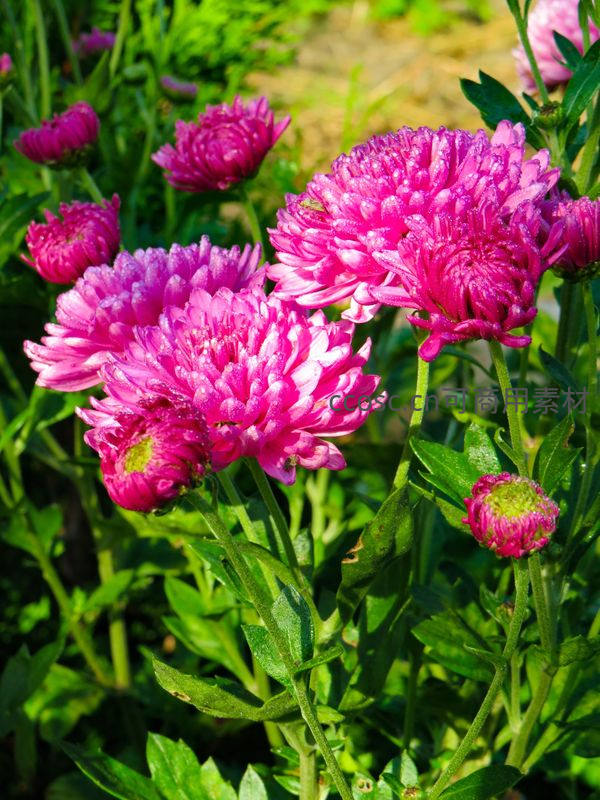 阳光洒落在一片紫色菊花丛中,花朵鲜艳欲滴,绿叶衬托,花苞与盛开花朵相映成趣,充满田园诗意与勃勃生机。