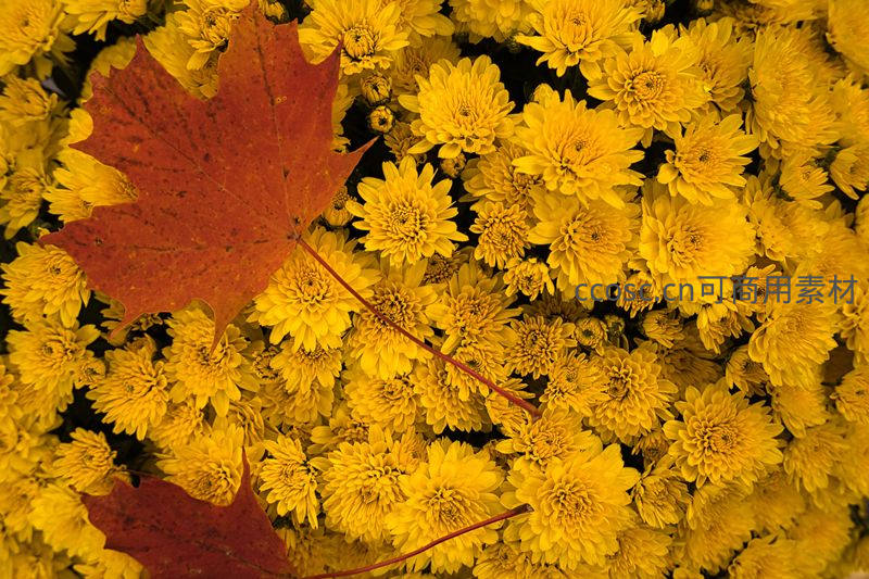 灿烂的黄色菊花铺满画面,两片火红的枫叶轻盈飘落其上,构成一幅浓郁秋意与自然丰收感交织的温暖视觉盛宴。