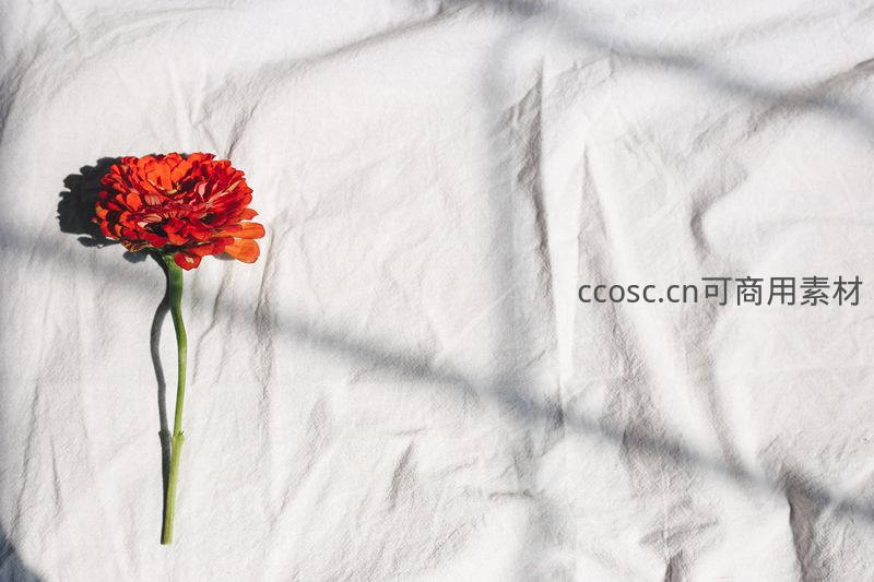 一朵鲜艳的红色花朵置于褶皱的白色织物上,阳光透过窗户投下清晰的树影,营造出宁静而富有诗意的视觉效果。