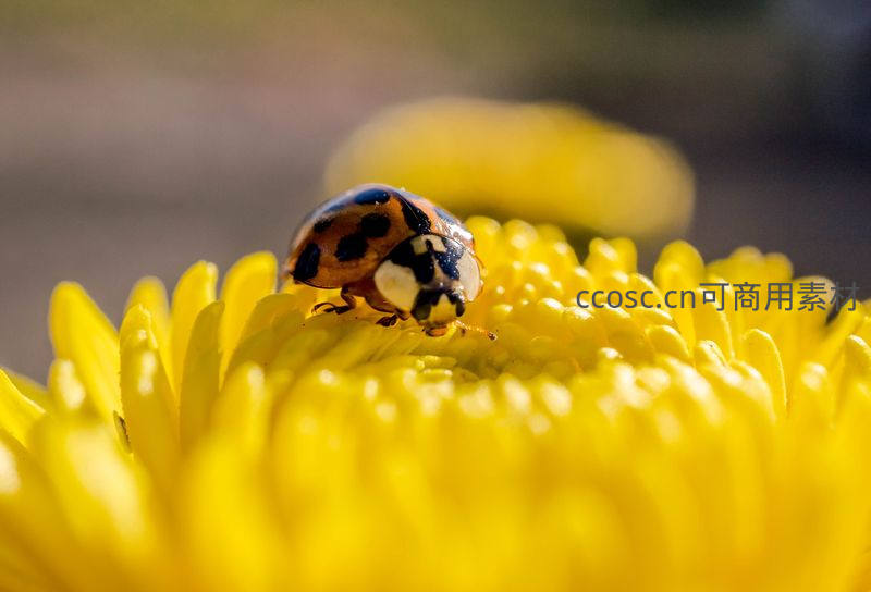 一只色彩斑斓的瓢虫停驻在盛开的黄色菊花花瓣上,微距镜头精准捕捉其精致的斑点与花蕊的细腻纹理,展现微观世界的生动活力。
