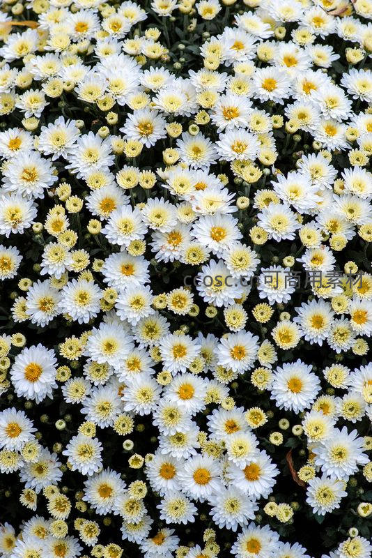 从高处俯瞰,无数洁白的菊花紧密相连,形成一片无垠的花海,黄色的花蕊点缀其间,宛如初雪覆盖大地,纯净而壮观。