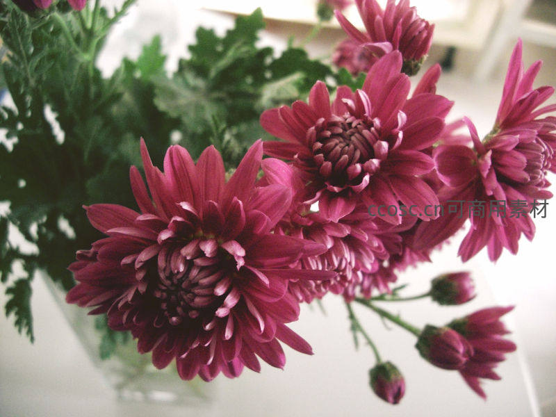 一束紫红色菊花置于透明花瓶中,搭配翠绿叶片,在柔和光线下散发宁静雅致气息,为家居空间增添艺术感。