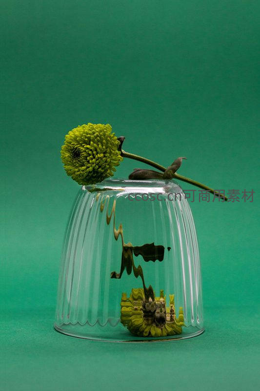 绿色菊花倒扣玻璃杯中艺术摆拍