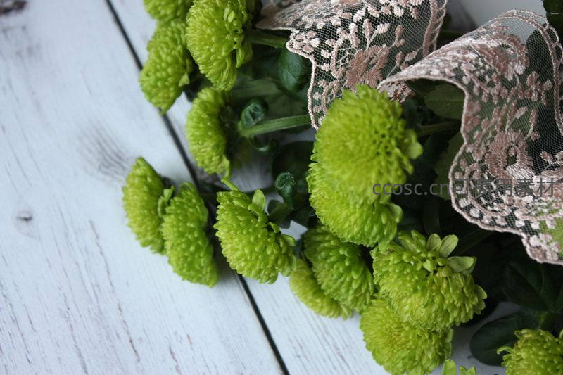 嫩绿色菊花簇拥在复古蕾丝旁,置于白色木板之上,光影柔和,营造出宁静雅致的视觉氛围。