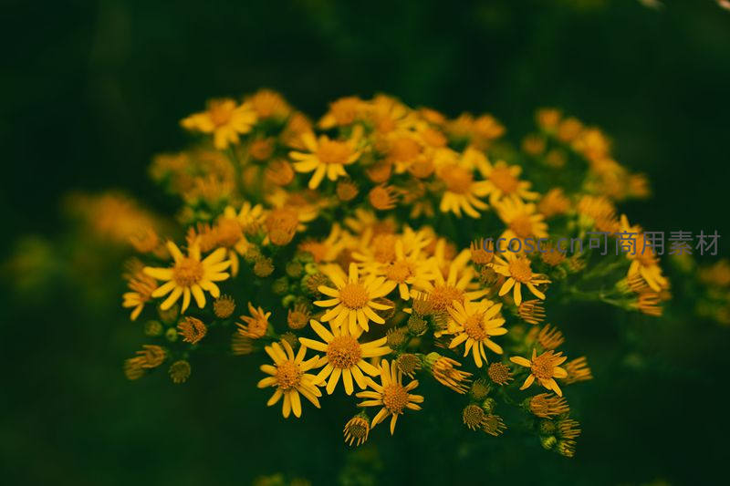在浓郁的绿色背景下,一簇金黄色的小野菊绽放着生机,微距镜头捕捉其细腻纹理,展现大自然的活力与温暖。