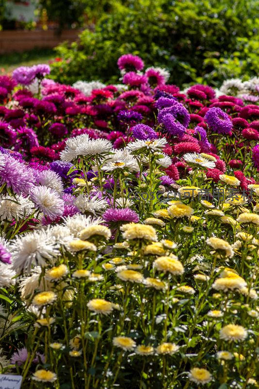 紫、白、黄三色菊花在阳光下竞相开放,构成一片绚烂的花田,绿叶点缀其间,展现大自然的蓬勃生机与无限魅力。