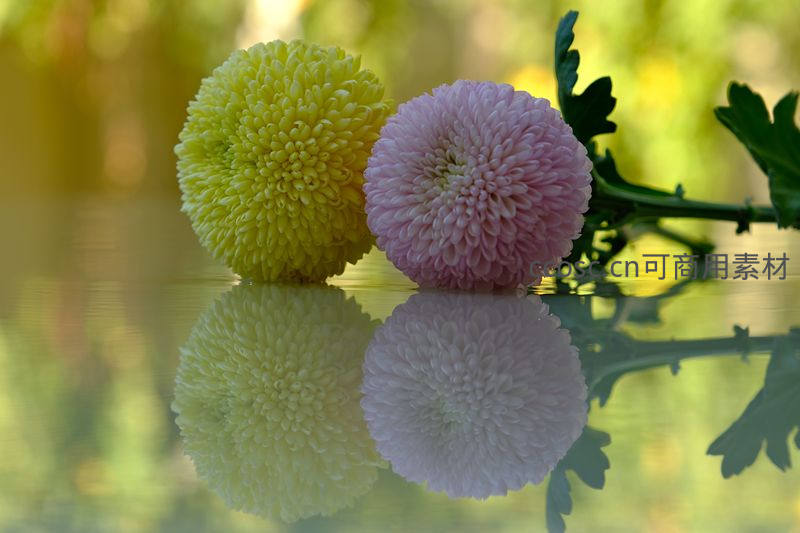 粉色与黄色两朵菊花并排浮于水面,倒影清晰,色彩对比鲜明,背景光斑点缀,构成一幅和谐唯美的自然画卷。