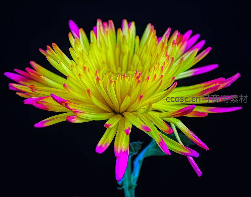 一朵经过色彩处理的菊花,在纯黑背景下呈现出荧光黄与粉紫撞色效果,极具视觉冲击力和艺术感。